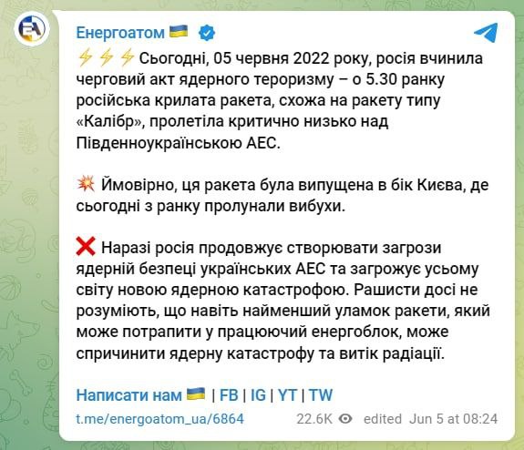 09:35 Утром 5 июня российская крылатая ракета пролетела над Южноукраинской АЭС на критически низкой высоте, сообщает "Энергоатом".