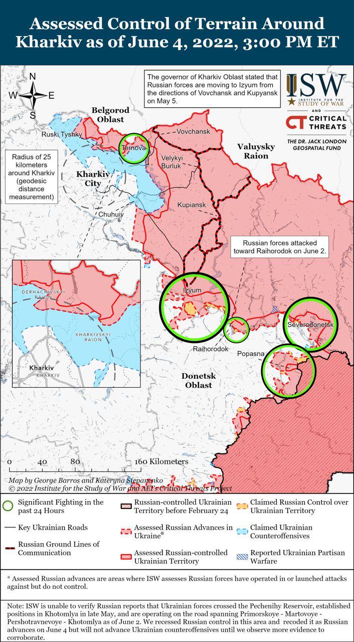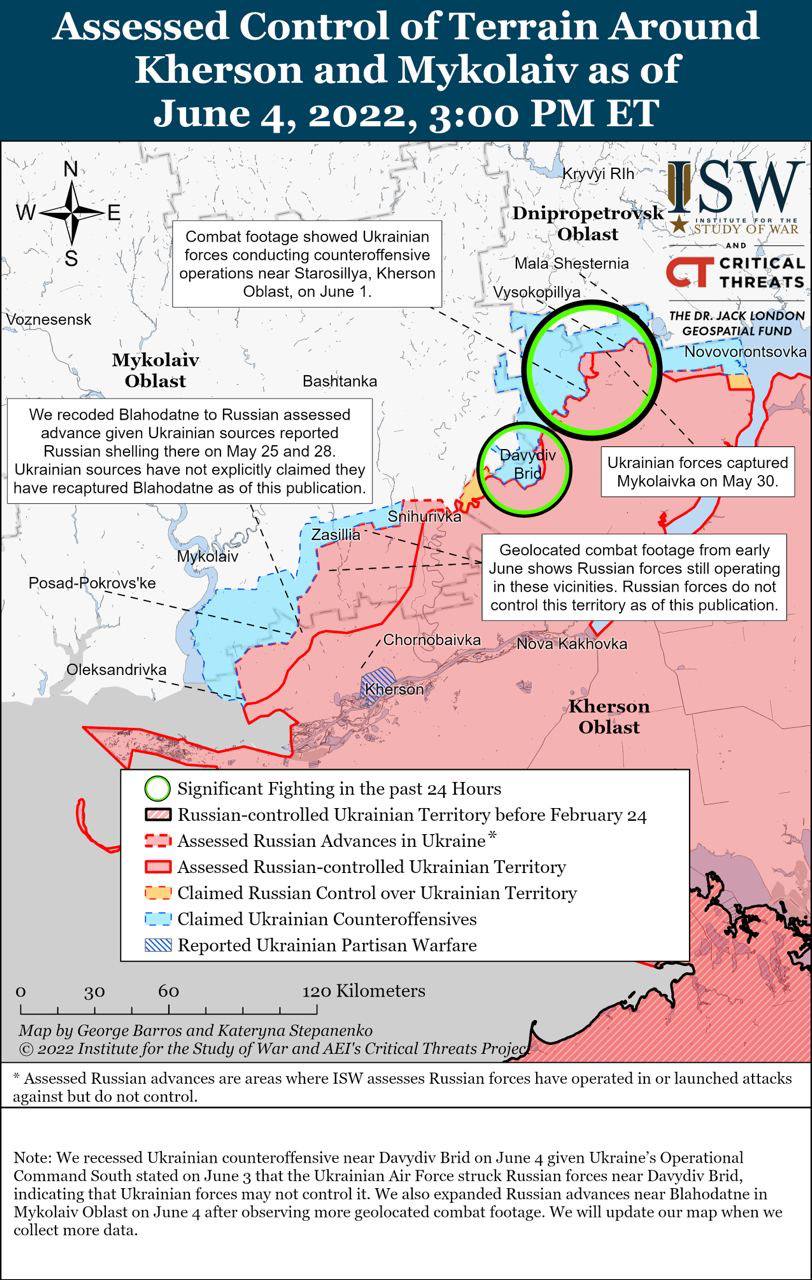 - За последние 24 часа украинские силы предприняли контратаки в Северодонецке, что, вероятно, свело на нет оперативный импульс, который российские силы ранее набрали за счет концентрации боевых подразделений и огневой мощи.