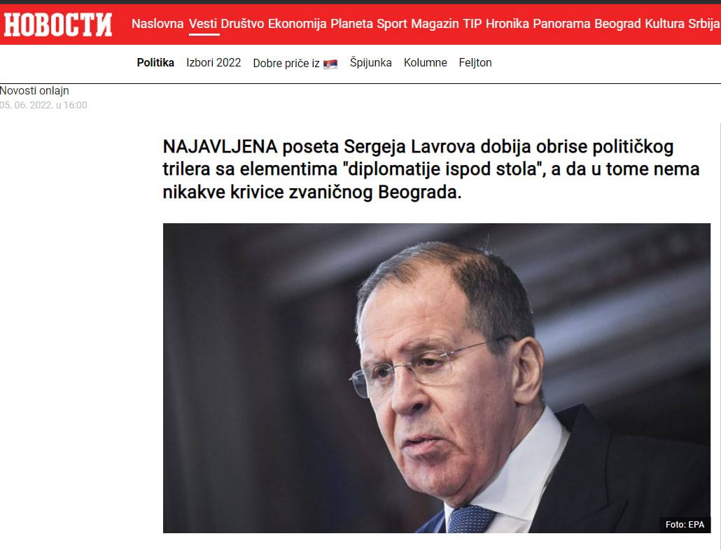 По информации издания, в связи с такими сложностями визит министра в Сербию, намеченный на 6–7 июня, "оказался под большим вопросом, но в этом нет никакой вины официального Белграда". Ранее президент Сербии Александр Вучич сообщал, что в стране рассчитывают на визит главы внешнеполитического ведомства России, но организация такой поездки сталкивается с рядом трудностей.