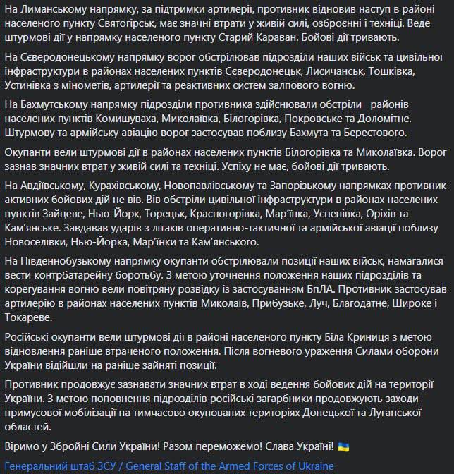 - Противник предпринял серию безуспешных наступательных операций юго-западнее Изюма и в районе Лимана.