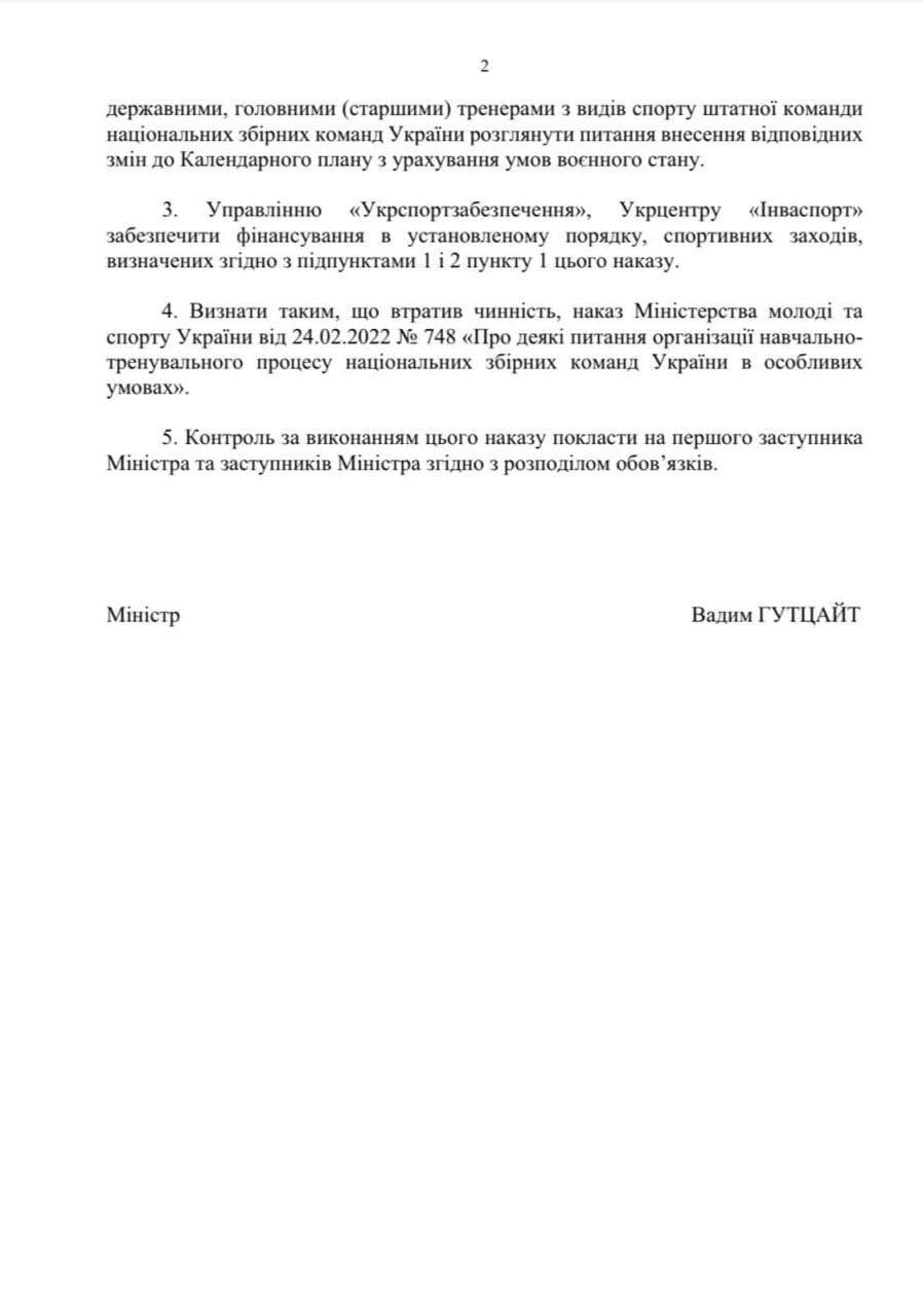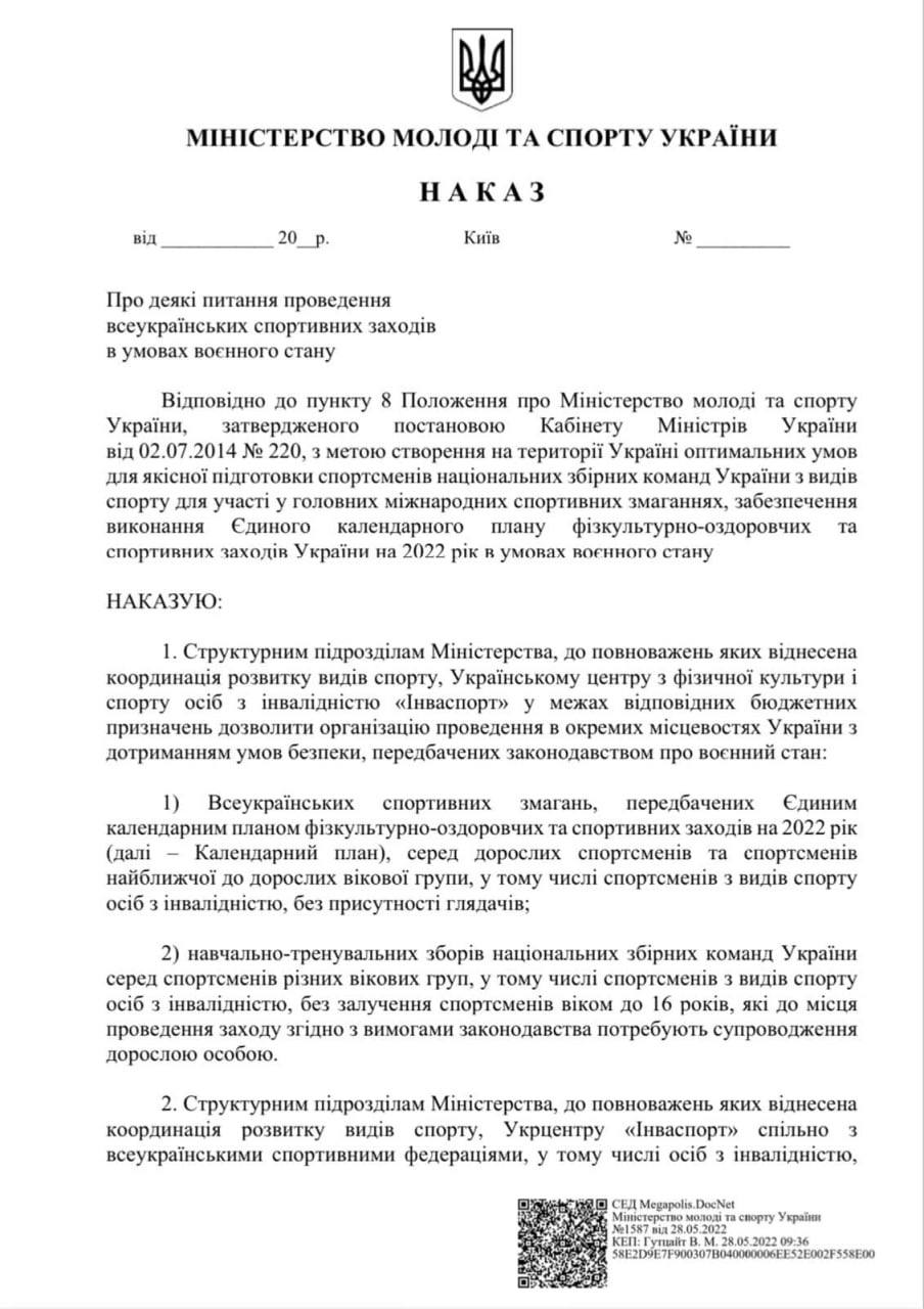 К слову, приказ о проведении спортивных мероприятий в Украине (но еще без номера), 31 мая публиковал нардеп Жан Беленюк.