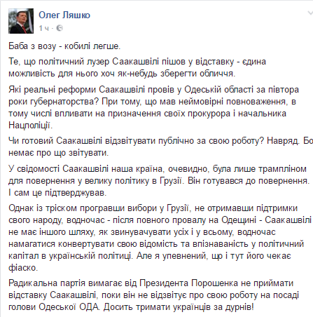 Лидер фракции "Радикальная партия" Олег Ляшко в выражениях не поскупился на оскорбления Саакашвили. Он назвал Михо "политическим лузером" и заявил, что для Саакашвили только отставка являлась единственной возможностью сохранить свое лицо после отсутствия адекватных реформ в Одесской области.