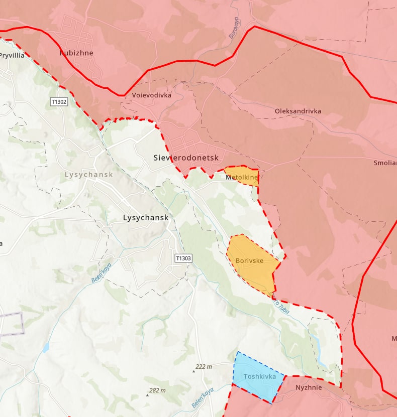 По Северодонецку Генштаб утром сообщал, что ВСУ сдерживают штурмовые действия россиян в городе, а также Тошковке и Устиновке (на правом берегу Северского Донца южнее Лисичанска).