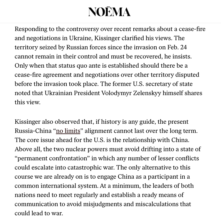 В интервью для Института Берггрюэна Киссинджер рассказал, что он имел в виду возвращение к положению вещей на 24 февраля, поскольку признание российских приобретений с того момента будет вознаграждением агрессии. А вот вопрос Крыма – это другая тема и предмет переговоров.