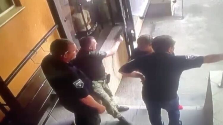 На видео с камер наблюдения видно, как возле входа в ЖК сотрудник Генштаба что-то эмоционально рассказывает трем охранникам, а потом нервно достает оружие и направляет его на ноги собеседнику. Тот спокойно отводит руку с пистолетом от своей ноги, а через несколько секунд неуверенно стоящий на ногах сотрудник Генштаба стреляет в сторону, даже особо не посмотрев, по чем он открывает огонь.