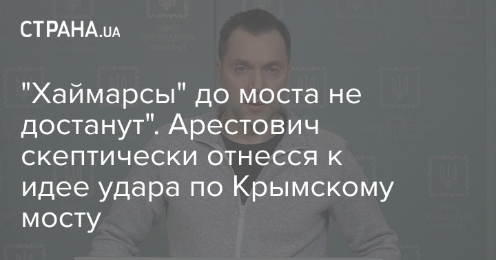 Советник Ермака заявил, что относится к этой идее скептически. По его словам, во-первых, "Хаймарсы" до моста не достанут. Во-вторых, опору моста тактической ракетой не взорвать.