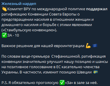 "По словам вице-премьера Стефанишиной, ратификация конвенции значительно улучшит нашу позицию и шансы на позитивное голосование в ЕС касательно членства Украины. В частности, изменит позицию Швеции", - пишет Железняк.