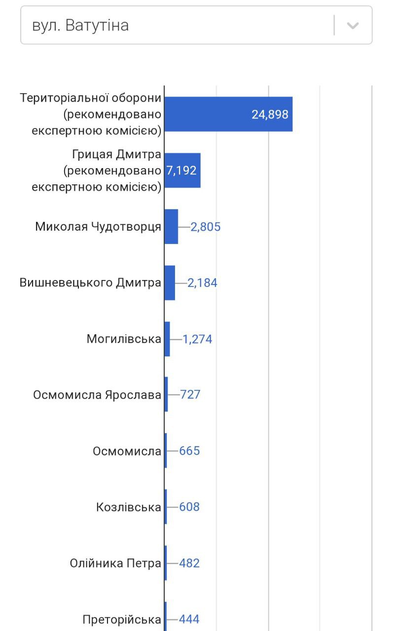 Улица Ватутина (войска под его командованием освобождали Киев от нацистов) может стать улицей Территориальной обороны. В качестве альтернативы предлагался вариант имени в честь оуновца Грицая, но этот вариант на втором месте с большим отрывом.