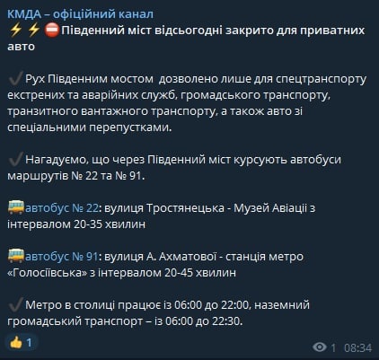 08:56 С сегодняшнего дня в Киеве перекрывают частное автомобильное движение по Южному мосту.