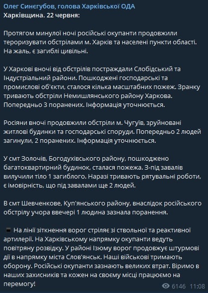 08:00 Сводка Генштаба ВСУ на утро 22 июня. Основные моменты: