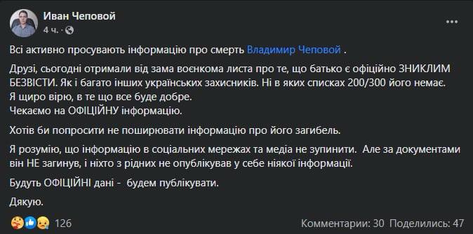 "Владимир Чеповой ушел на фронт добровольцем ТРО и погиб в первые недели июня. Тело только вчера идентифицировали", - написал он.