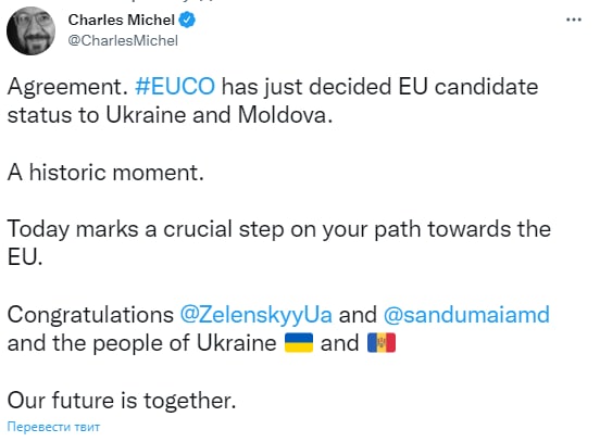 21.32 А вот и официальное подтверждение Шарля Мишеля - Украине и Молдове дали статус кандидатов на вступление в ЕС.