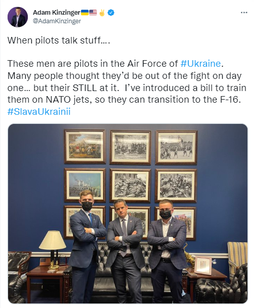 "Эти мужчины - пилоты ВВС Украины. Многие люди думали, что выйдут из боя в первый день, но они все еще там. Я внес законопроект об обучении их на самолетах НАТО, чтобы они могли перейти на F-16", - написал он.