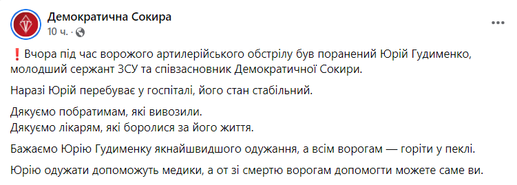 Основатель "Демсокири" и блогер Юрий Гудыменко ранен в бою.