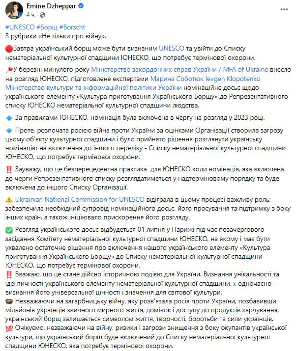 "В марте прошлого года министерство внесло на рассмотрение ЮНЕСКО номинационное досье по отношению к украинскому элементу "Культура приготовления украинского Борща" в репрезентативный список ЮНЕСКО нематериального культурного наследия человечества", – рассказывает Джапарова.