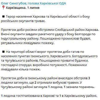 За минувшие сутки россияне обстреляли Слободской район Харькова. Также они нанесли ракетный удар со стороны Белгорода по Индустриальному району. Там повреждены промышленные здания.