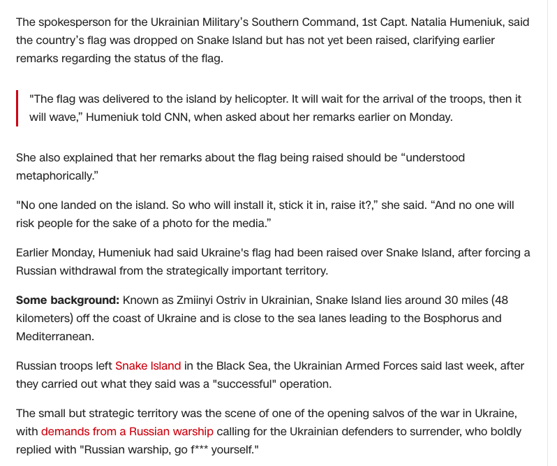 Пресс-секретарь Оперативного командования "Юг" Наталья Гуменюк уточнила свои слова о поднятом флаге Украины над островом Змеиный. Она говорит, что ее слова о поднятом флаге следует "понять метафорически", а опубликованное фото - старое.