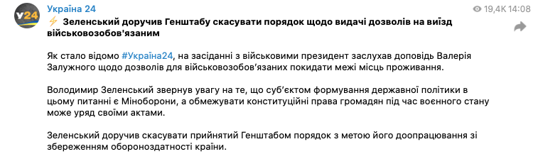 На заседании с военными президент заслушал доклад главкома ВСУ Валерия Залужного по поводу разрешений для военнообязанных покидать пределы мест жительства.