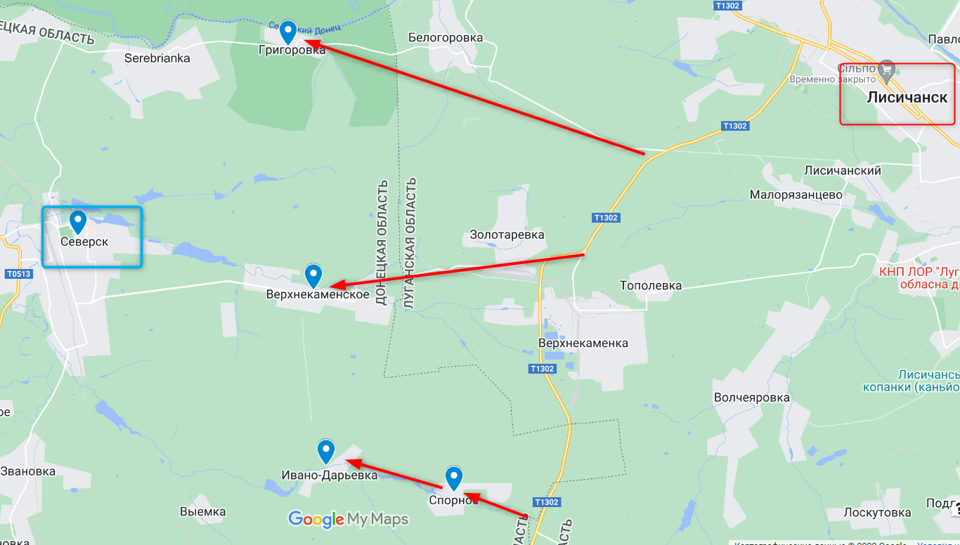 Российские телеграм-каналы сообщают, что брать Северск в лоб пока не получается, и наверняка будут попытки обойти его с юга. Южнее в этом районе как раз идут бои вокруг Спорного и Ивано-Дарьевки (Спорное, по данным россиян, уже захвачено, оттуда публикуются видео, хотя по другим данным, ВСУ еще удерживают окраины села).