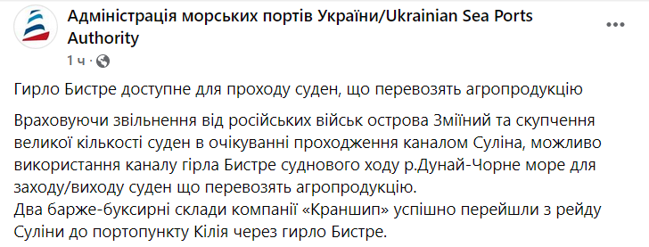 "Учитывая освобождение от российских войск острова Змеиный и скопление большого количества судов в ожидании прохождения по каналу Сулина, возможно использование канала устья Быстрое судового хода р. Дунай - Черное море для захода/выхода судов, перевозящих агропродукцию", - говорится в сообщении.