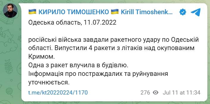 11.45 Россияне выпустили по Одесской области четыре ракеты, есть попадание в жилой дом, пишет заместитель главы Офиса президента Кирилл Тимошенко.