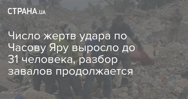 Число погибших в результате удара российских войск по Часову Яру Донецкой области возросло до 31 человека.