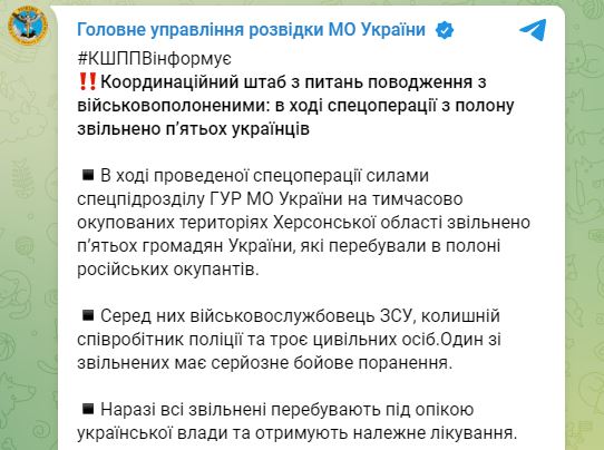 Среди освобожденных - военнослужащий ВСУ, бывший сотрудник полиции и трое гражданских лиц. Один из освобожденных имеет серьезное боевое ранение.