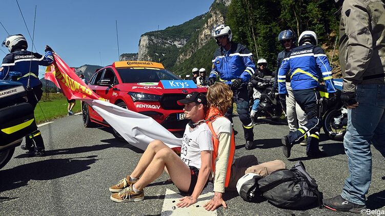 Гонка была приостановлена за 35 км до финиша. Нарушители призывали обратить внимание на проблему изменения климата. Они не только сковали себя наручниками, но и намазали руки клеем.