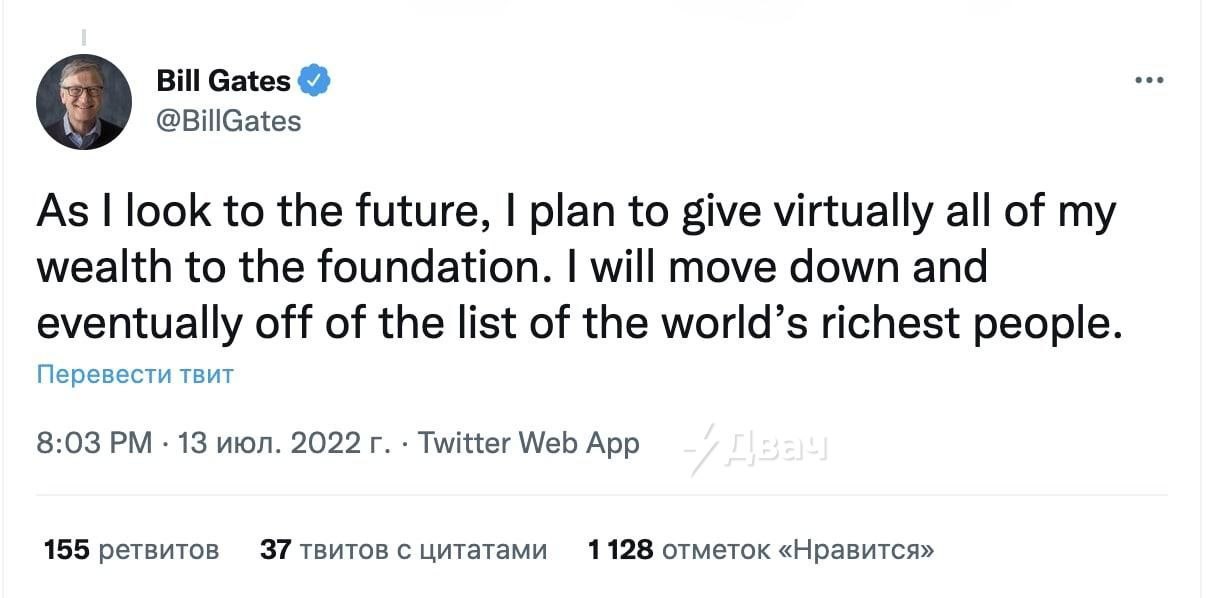 "Я планирую отдать фонду практически все свое состояние и в итоге выйду из списка богатейших людей мира", - написал Гейтс в Twitter.