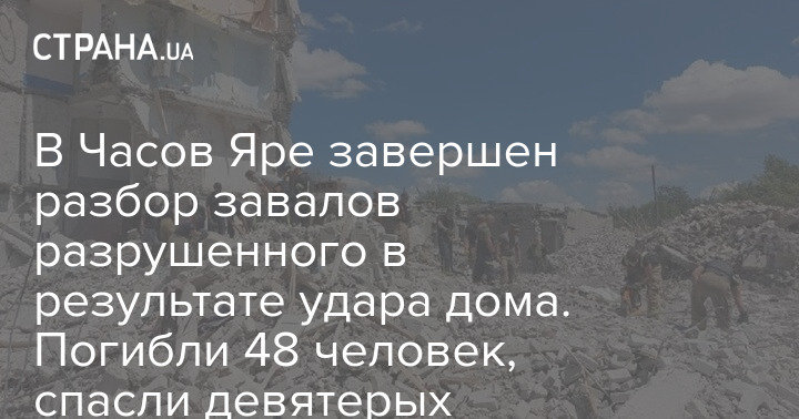Спасательные работы на месте обрушившегося дома в Часов Яре, который атаковали российские войска ракетами из "Ураганов" вечером 9 июля, завершились.