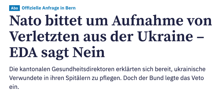 Швейцария отказалась лечить у себя раненых бойцов ВСУ из-за нежелания нарушать нейтральный статус страны и Женевские конвенции, которые требуют от нейтральных стран интернировать (лишать свободы передвижения) раненных военных.