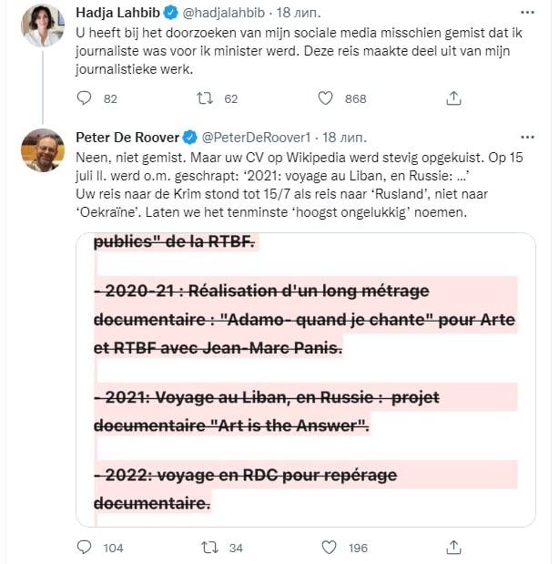 Бельгийский политик, депутат Нового фламандского альянса Петер де Роовер заявил, что страницу в Википедии об Адже Лябиб отредактировали вскоре перед ее назначением, удалив информацию о поездке в Крым. "Среди прочего, 15 июля было удалено следующее "2021: поездка в Ливан и Россию… До 15.07 ваша поездка в Крым была поездкой в "Россию" а не "в Украину", - заявил он.