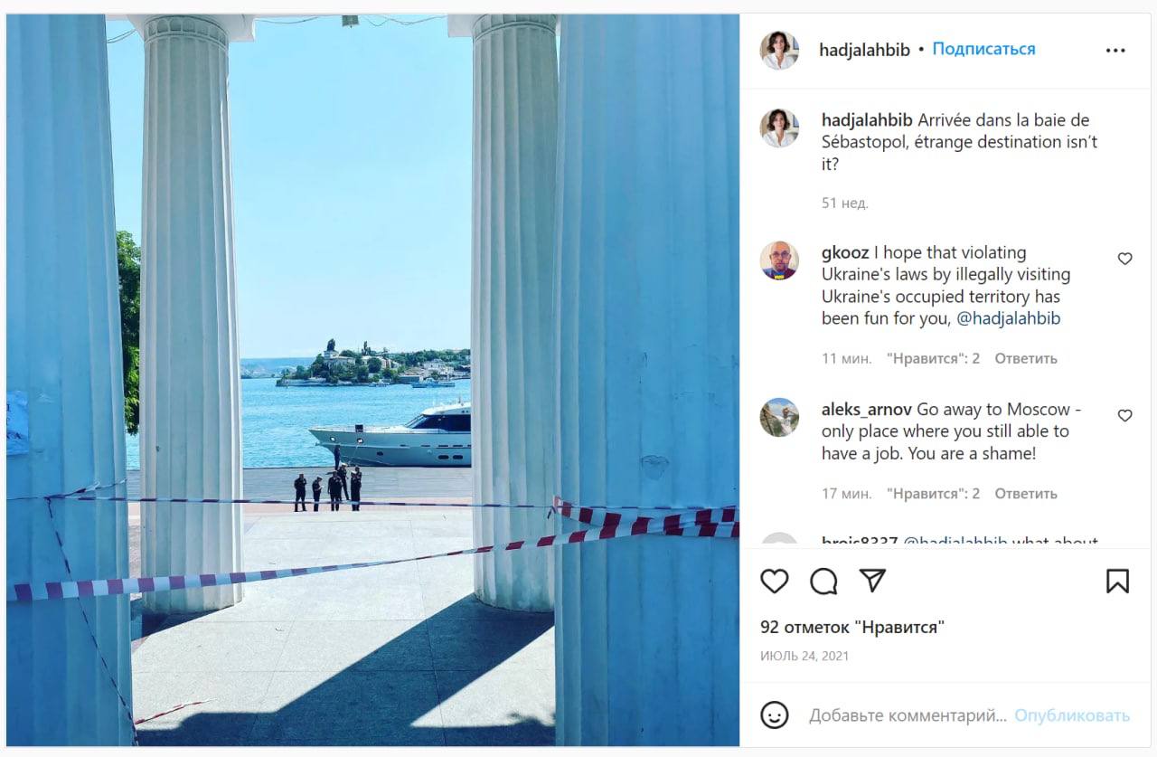 Новая министр иностранных дел Бельгии Аджа Лябиб в июле 2021 года посетила аннексированный Россией Крым. Соответствующий пост она опубликовала 24 июля 2021 г. в своем Instagram.