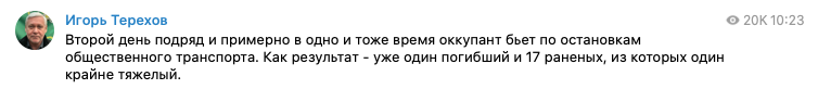 "Второй день подряд и примерно в одно и тоже время оккупант бьет по остановкам общественного транспорта. Как результат - уже один погибший и 17 раненых, из которых один крайне тяжелый", - заявил Терехов.