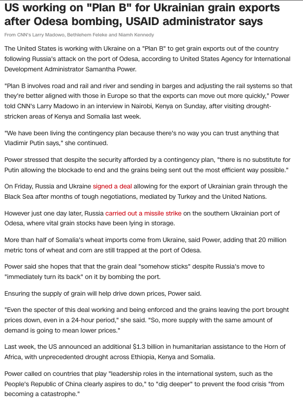 "План Б включает в себя автомобильный, железнодорожный и речной транспорт, а также отправку барж и корректировку железнодорожных систем, чтобы они были лучше согласованы с европейскими, чтобы экспорт мог двигаться быстрее", — сказал Пауэр и добавила, что "нельзя доверять ничему из того, что говорит Владимир Путин".