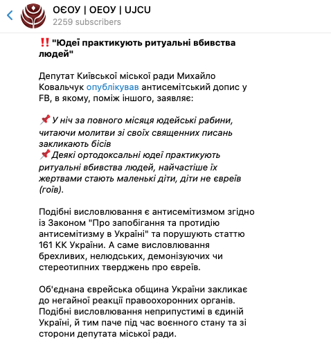 "Объединенная еврейская община Украины призывает к немедленной реакции правоохранительных органов. Подобные высказывания недопустимы в единой Украине, и тем более во время военного положения и со стороны депутата городского совета", - говорится в сообщении организации.