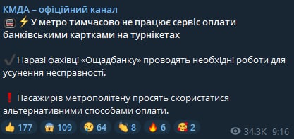 В метро Киева утром в четверг, 28 июля, произошел сбой. Временно не работает сервис оплаты банковскими картами на турникетах.