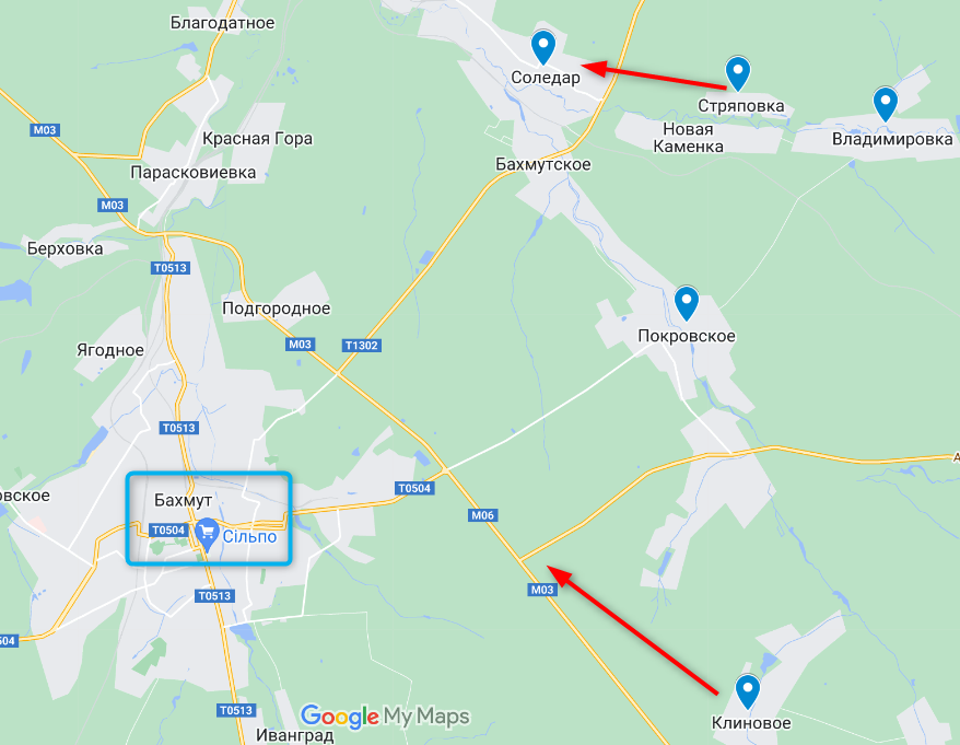 Сегодняшние сводки сообщают, что основное наступление россиян разворачивается к югу и востоку от Бахмута.
