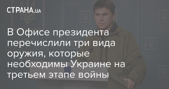 Советник главы Офиса президента Михаил Подоляк заявил, что Украина сейчас находится на третьем этапе войны, и ключевым оружием, которое ей сейчас необходимо, являются реактивные системы залпового огня (РСЗО).