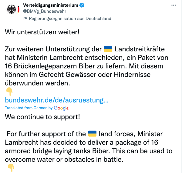 Германия передаст Украине 16 бронированных мостоукладчиков Biber, которые позволяют возводить мосты для преодоления водных или иных преград в бою.