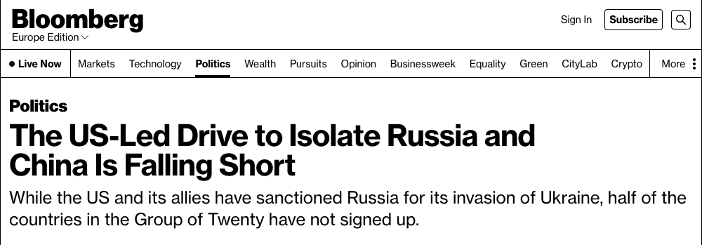 Западу не удается убедить остальной мир поддержать изоляцию РФ - Bloomberg