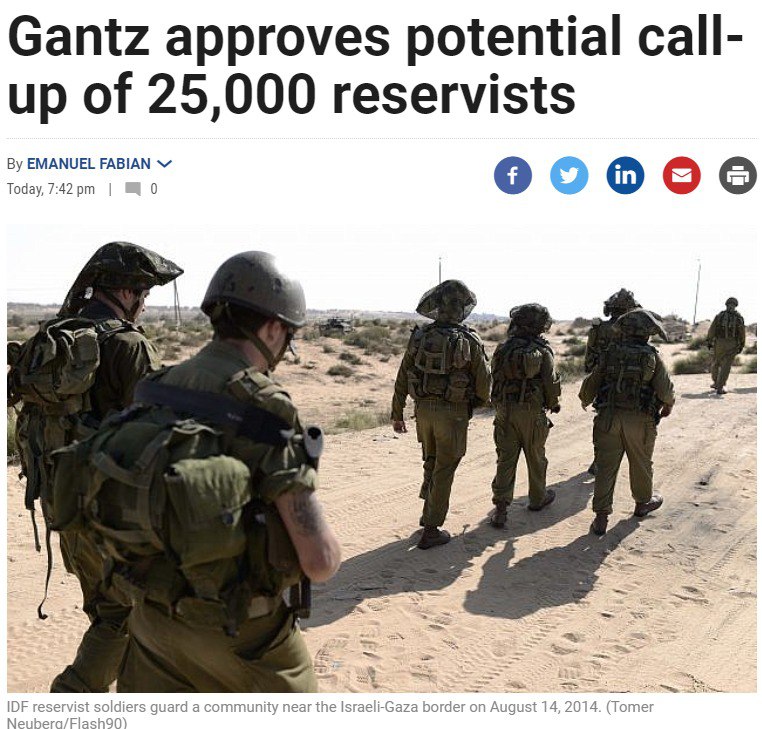 Министр обороны Израиля Бени Ганц утвердил приказ о призыве 25 000 резервистов "для оперативных целей".