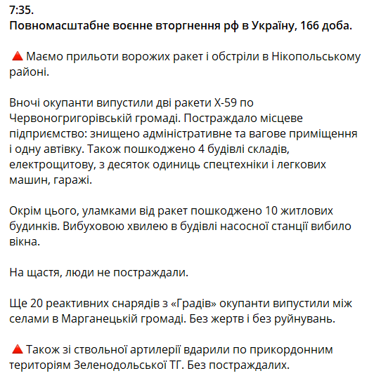 Ночью с 7 на 8 августа россияне нанесли ракетный удар по Червоногригоровской громаде - между Никополем и Марганцем, на правом берегу Днепра.