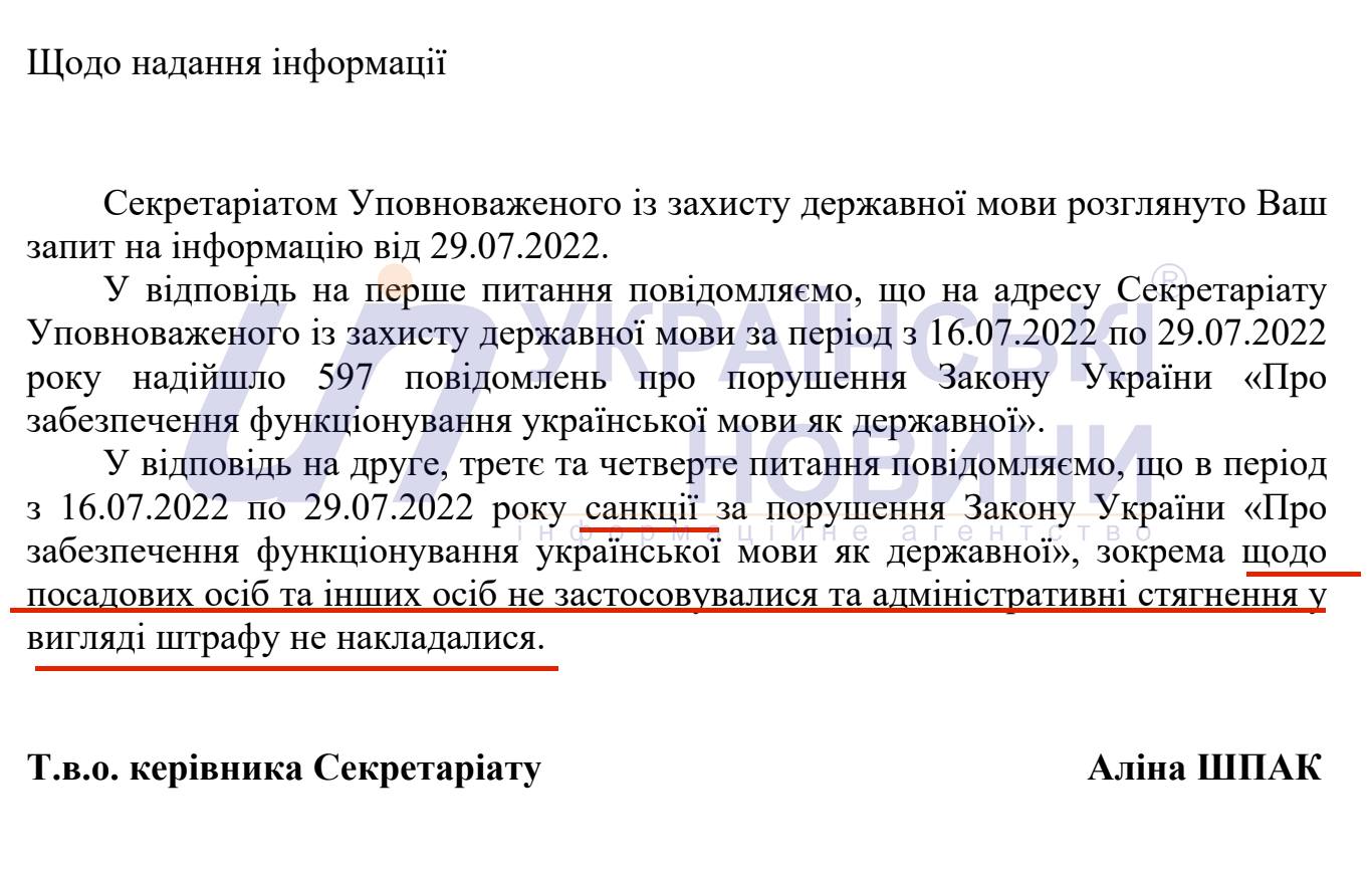 За три недели работы языкового закона мовный омбудсмен Тарас Креминь никого не оштрафовал. Хотя у него есть такие полномочия с 16 июля и за это время он уже получил почти 600 жалоб, как сообщили в его секретариате.