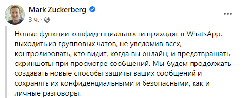 По данным Цукерберга, мессенджер WhatsApp внедрит возможность запрета на скриншоты сообщений, настроенных на автоудаление. Кроме того, пользователи WhatsApp получат возможность выходить из групповых чатов, не оповещая при этом остальных партнеров по переписке и ограничивать круг людей, которым будет виден их статус "в сети".