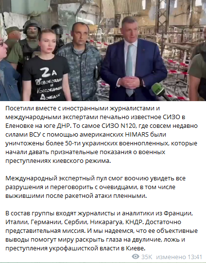 "Международный экспертный пул смог собственными глазами увидеть все разрушения и переговорить с очевидцами, в том числе выжившими после ракетной атаки пленными", - написал он.