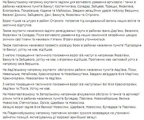 На Бахмутском направлении оккупанты задействовали для огневого поражения артиллерию и танки в районах населенных пунктов Бахмут, Константиновка, Соледар, Зайцево, Торецк, Яковлевка, Белогоровка, Покровское, Кодема и Майорск. Нанесли авиационные удары вблизи Вершины, Веселой Долины, Зайцева, Дачи, Бахмута, Яковлевки и Спорного.