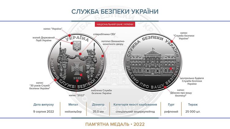 На медали есть надпись "30 лет Службе безопасности Украины" и изображены двое сотрудников СБУ. Также там есть герб Украины и герб СБУ.