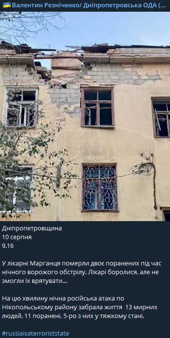 Число погибших из-за обстрела Марганца в ночь с 9 на 10 августа увеличилось до 13 человек. В больнице Марганца умерли двое раненых.