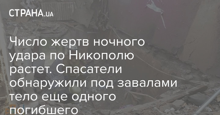 Во время разбора завалов в Никополе, образовавшихся после удара ночью с 10 на 11 августа, обнаружили тело еще одного погибшего. Общее число жертв увеличилось до трех человек.